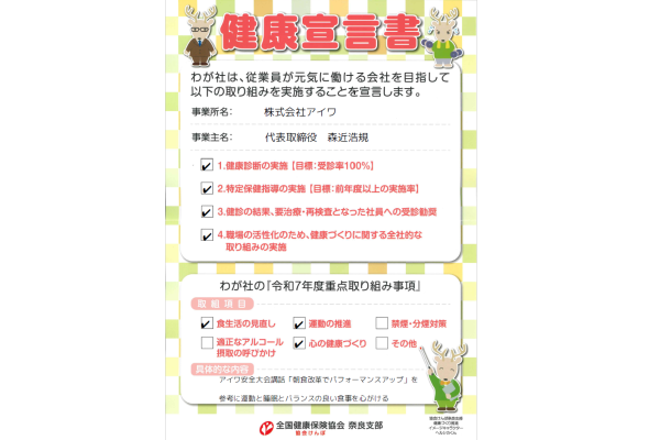 協会けんぽ奈良支部様が企画されています「職場まるごと健康宣言」を継続しています。今年も、7月1日~9月30日の3ヶ月間を重点活動期間として、社員全員が設定した個人目標を共有して楽しみながら健康づくりに取組んでいます。連日の猛暑ですが、特に現場作業...